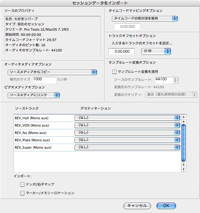 このオプションのキモは、インポート元(ソース)のサンプルレートを設定できる所にあります。゚プル・アップ/ダウン、NTSC/PAL変換作業に使えるわけです。加えて、「外部クロックとセッションのサンプルレートが違っていた場合」という考えたくもないトラブルにも対処できます。