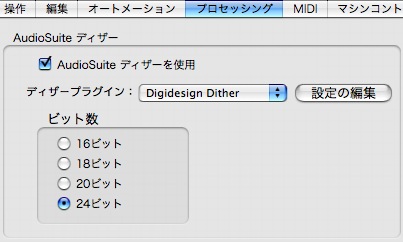 …「AudioSuiteディザー」をONにしておくと、ディザーが必要なAudioSuite処理の際に、設定したディザー(デフォルトではDigidesign Dither)が、自動的に適用されます。
