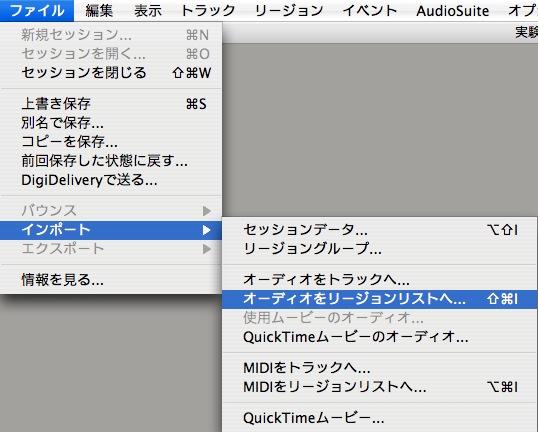 これは、「ワークスペース」からリージョンリストへ、オーディオファイルをドラッグ&ドロップして追加した場合に有効なメニューです。(Finderからも同様に可能ですが、現時点ではバグがあるのでオススメ出来ません。)