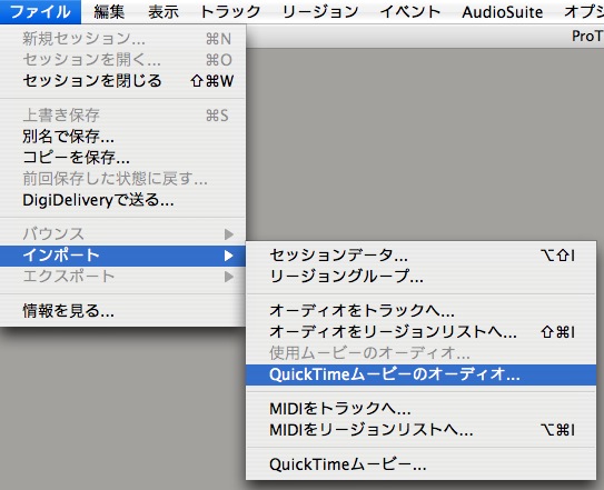 ProToolsはQuickTime形式を直接サポートしていないので、セッションのフォーマットに従ったサウンドファイルへの変換が必要です。